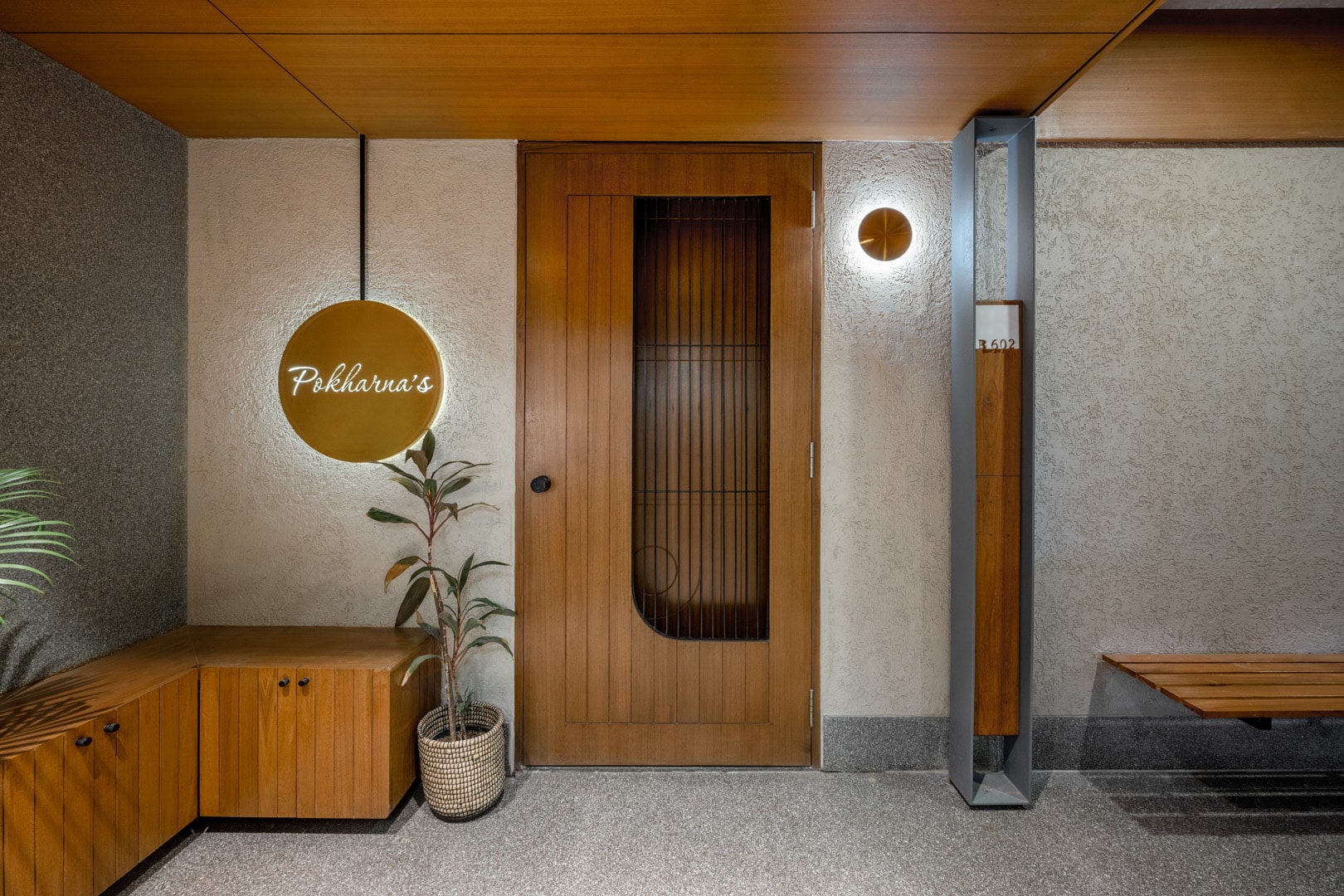 One of the standout features of this home is the incorporation of five golden circles, each etched with minimal graphics representing the zodiac signs of the family members. This subtle yet meaningful design element adds a personal touch and a sense of belonging to the space. The mandir, located at the end of the passage, serves as a serene and sacred space for the family to engage in their daily rituals. This house, much like the different zodiac signs and personalities of its inhabitants, shows us the unity amidst individuality, celebrating the unique traits of each family member while fostering a sense of togetherness.