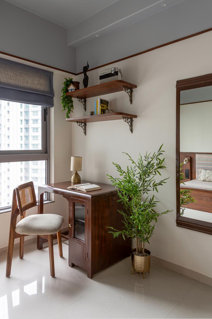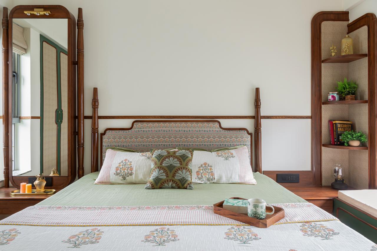 Each bedroom in Ulka unfolds as an expression of individuality. The master bedroom exudes quiet grandeur with its forest-green palette and upholstered headboard framed by delicate columns, a nod to traditional Indian design reinterpreted through a refined, modern lens.