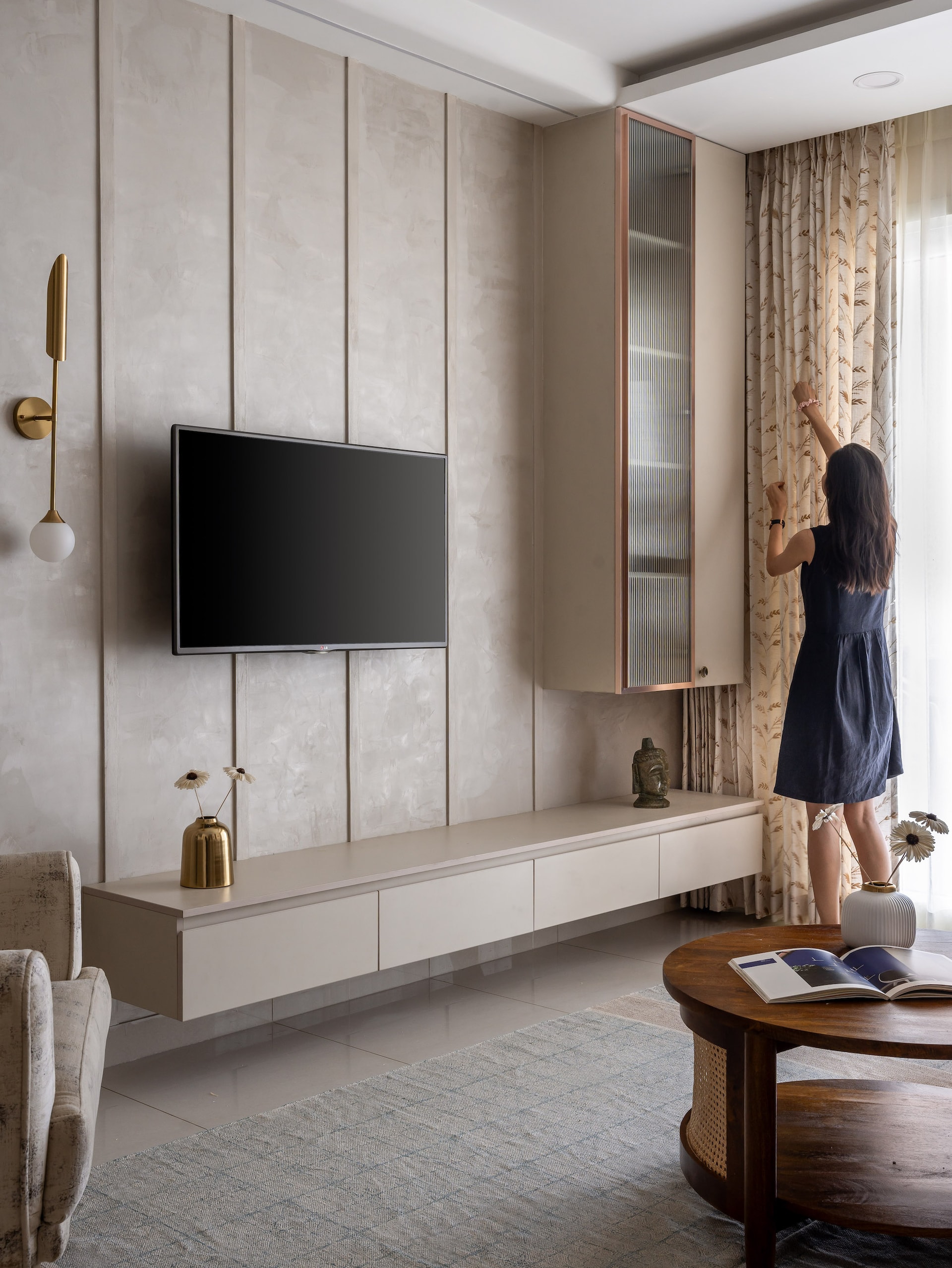 The living room, a quintessential expression of modern minimalism, features a sleek TV unit with vertical paneling as its focal point. Below, a floating cabinet offers ample storage, maintaining a clean, uncluttered aesthetic. The space is further enhanced by a gold wall sconce and a decorative vase, infusing an elegant touch. Curtains with a delicate leaf pattern subtly bring nature indoors, echoing the tranquil environment.