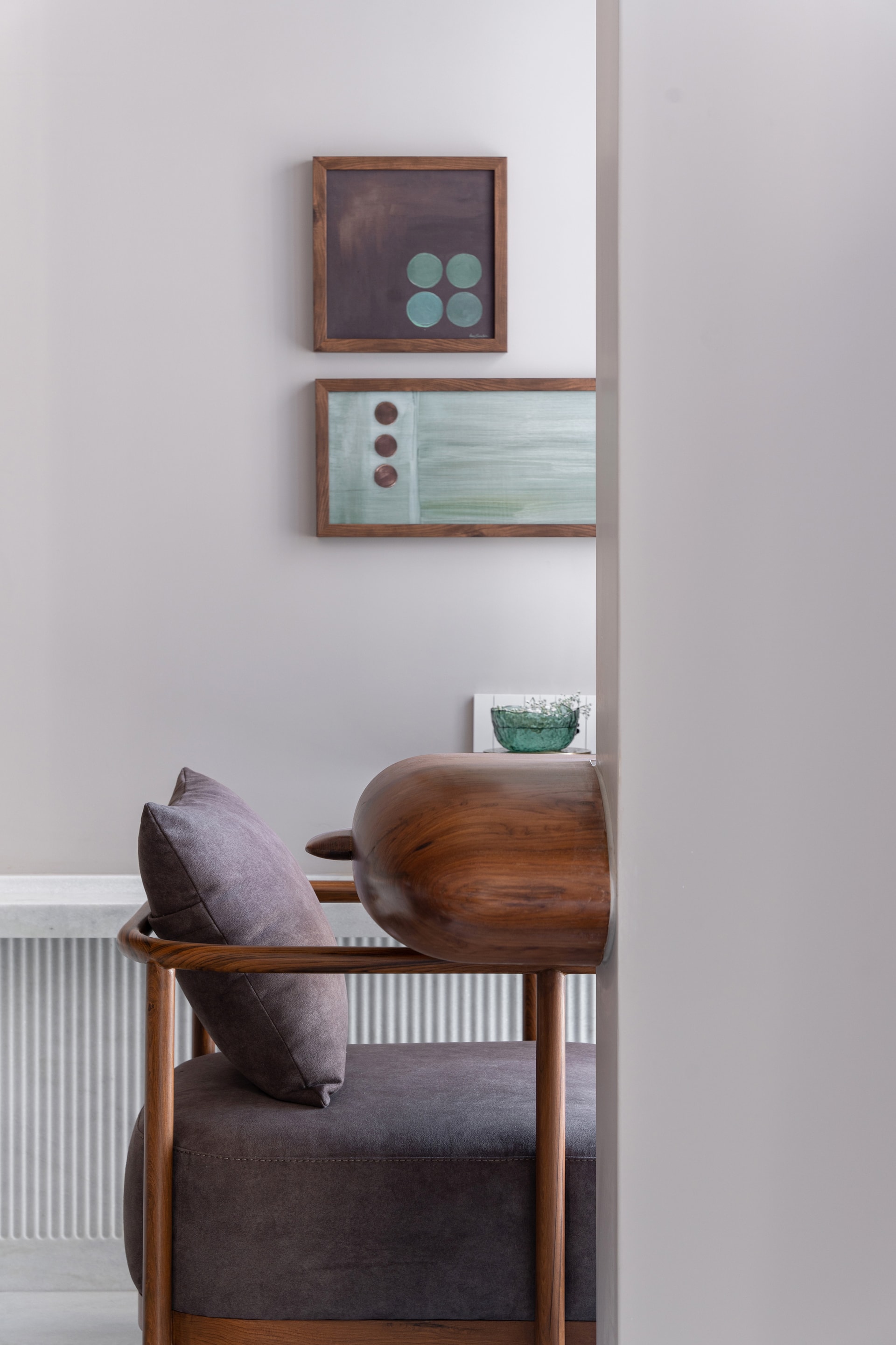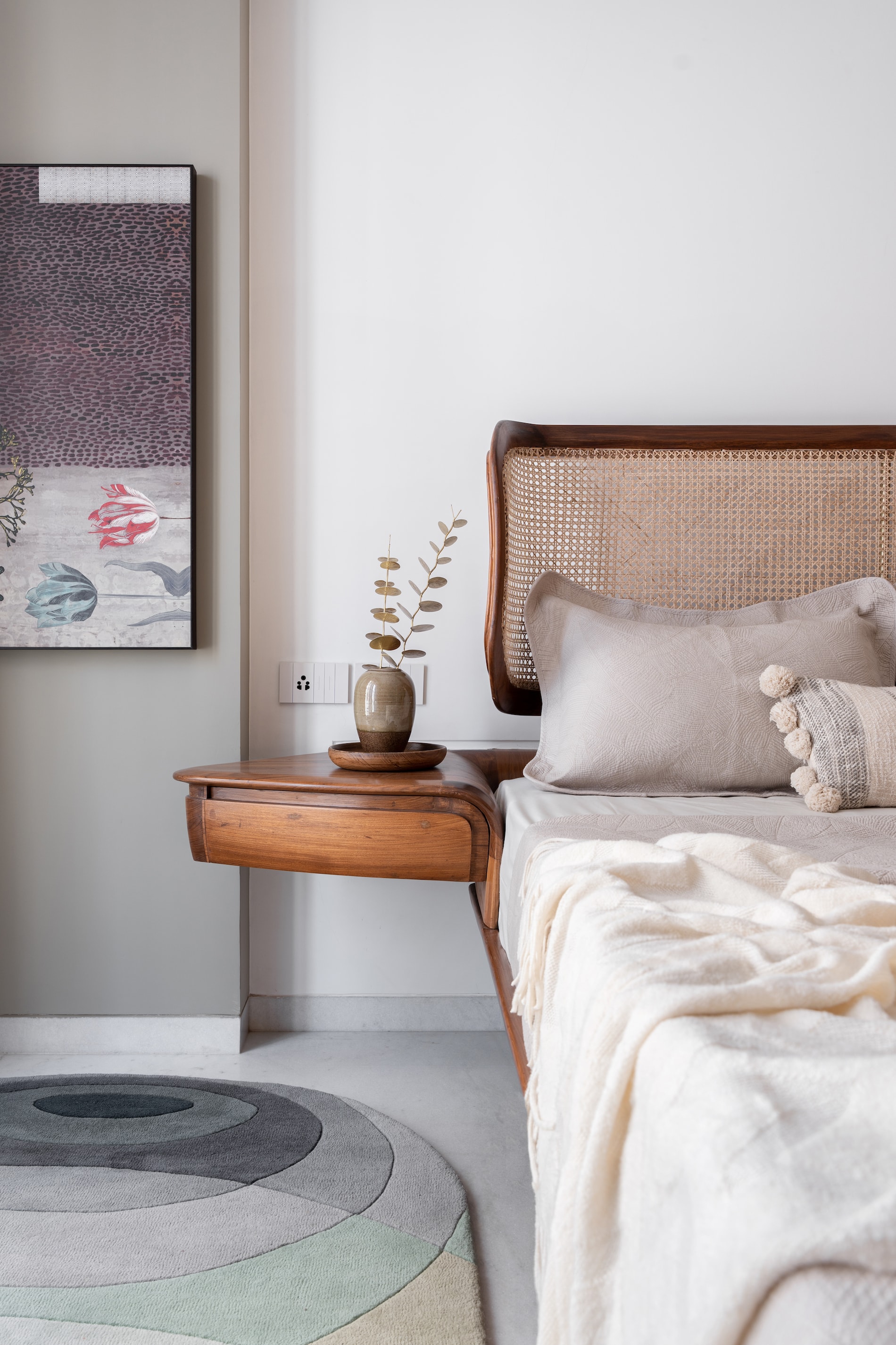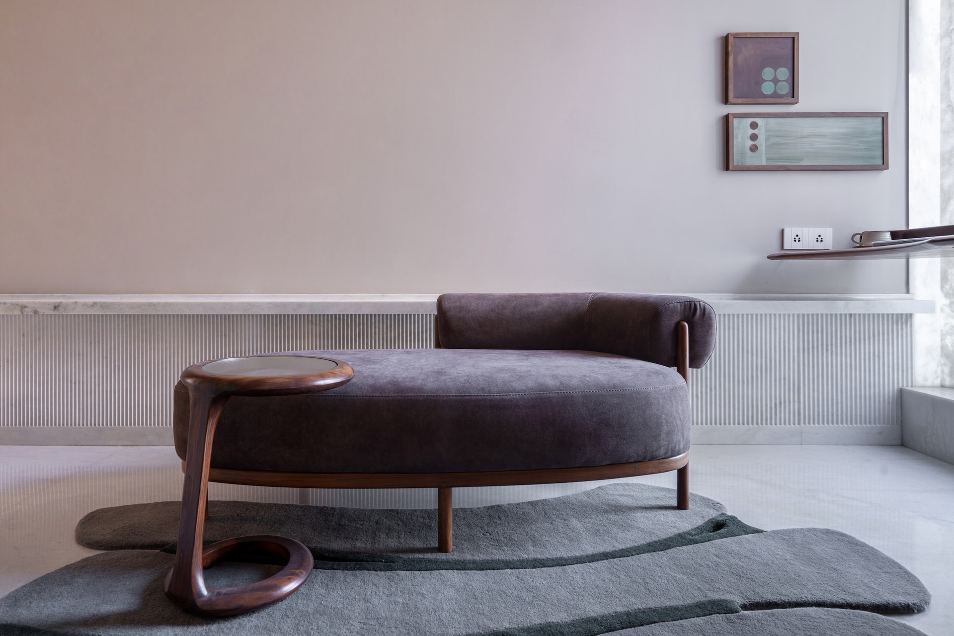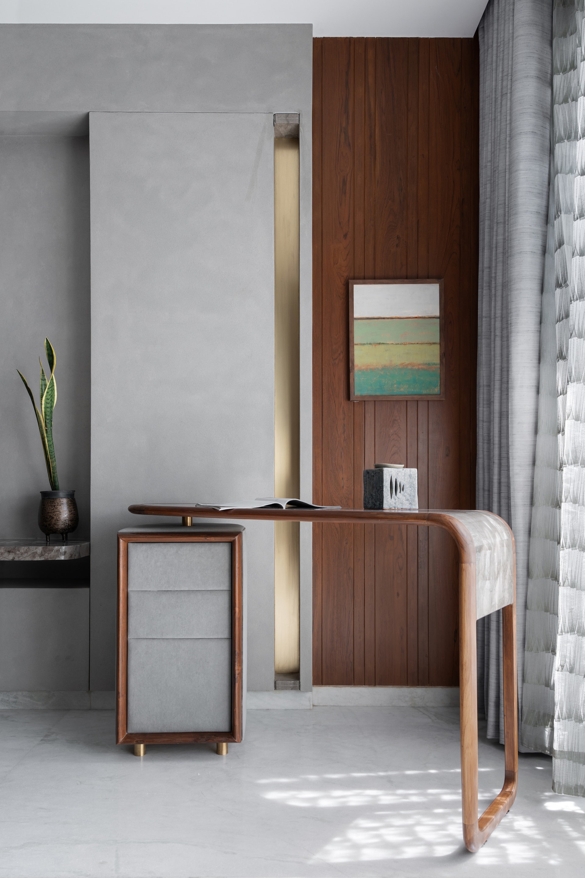 To further elevate the bedroom’s functionality and aesthetics, the design introduced an ergonomic yet sleek console table, featuring a curved solid teak wood edge, seamlessly supported by the wall. The design philosophy revolves around the celebration of materials in their truest form while preserving functionality and aesthetics. This integration is a true testament to the commitment to crafting spaces that are not just beautiful but also deeply enriching.