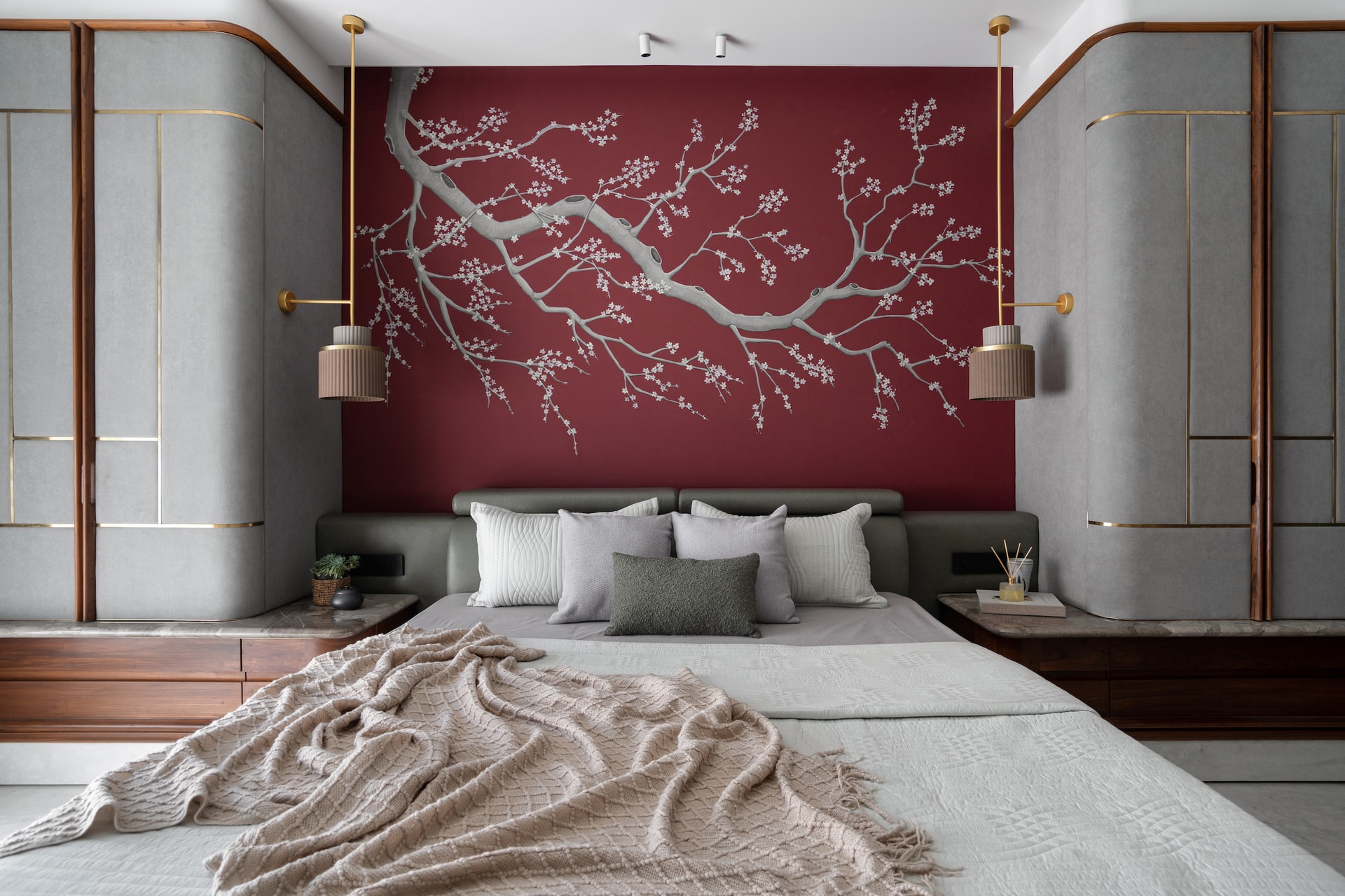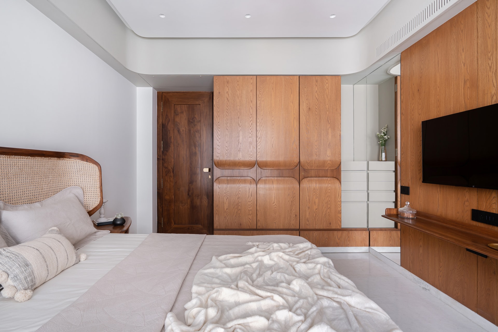 Moving into the grandparent’s room, the space is designed with a focus on warm elements, a creative direction where the room embraces abundant natural light devoid of jarring features. A haven of serenity that pays homage to the timeless allure of wood and the organic beauty of cane. The centrepiece of this tranquil retreat is the thoughtfully designed central bed, where the graceful fusion of wood and cane in the bed back transcends mere aesthetics, enveloping the bedroom in an aura of serenity and rooted charm. The design intent here was to create a space that not only embodies beauty but also facilitates spiritual living, inviting residents to harmonise with the symphony of peace. Bathed in natural daylight and accentuated by gracefully synchronised curves, the wardrobe design reflects the space’s inherent fluidity, harmoniously complementing the modern curvilinear ceiling. A palette featuring earthy tones and natural textures, elegantly merged with soft off-whites, fosters an environment that exudes tranquility, balance, and a serene retreat where parents can unwind in perfect harmony with their surroundings.