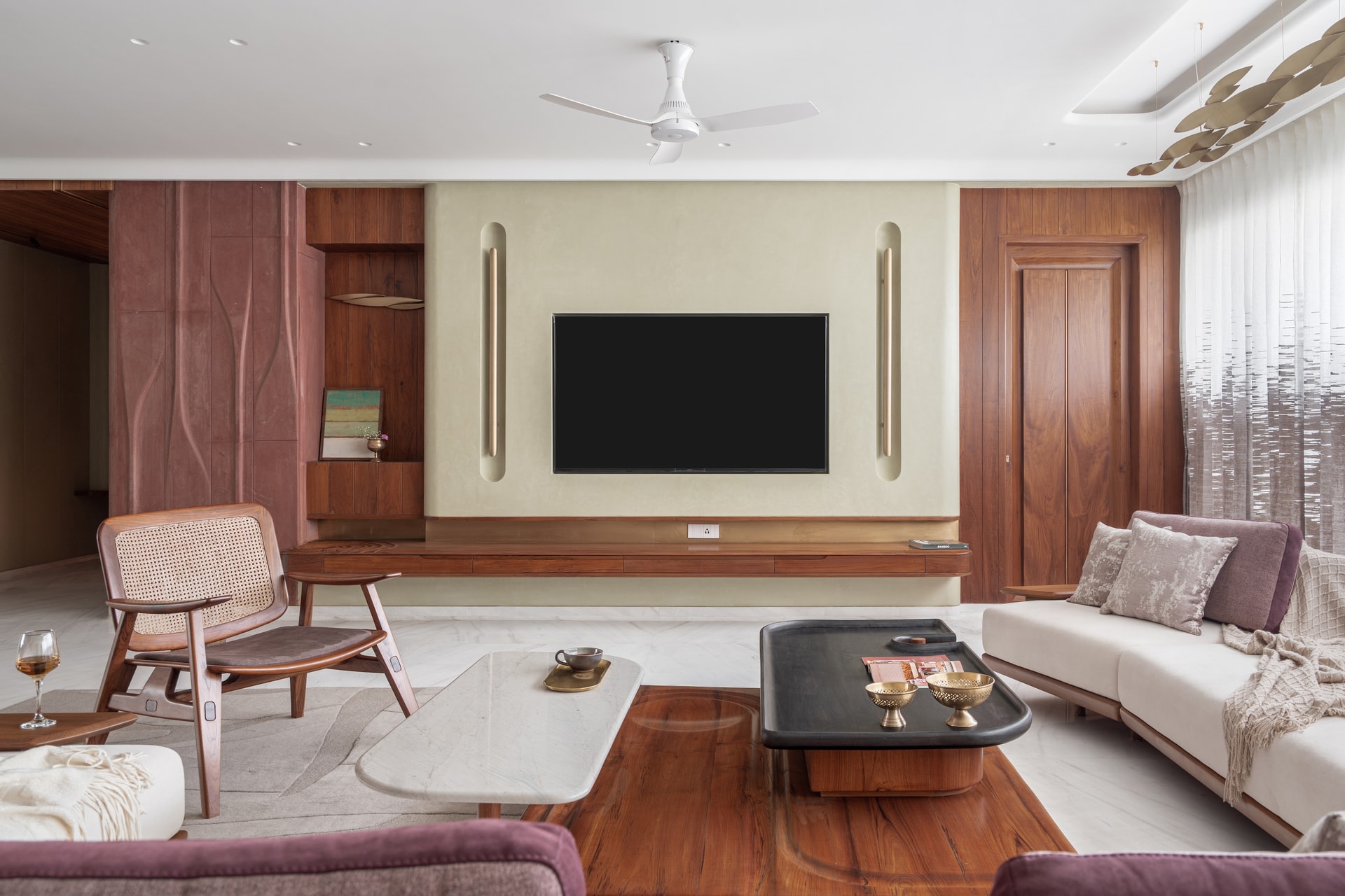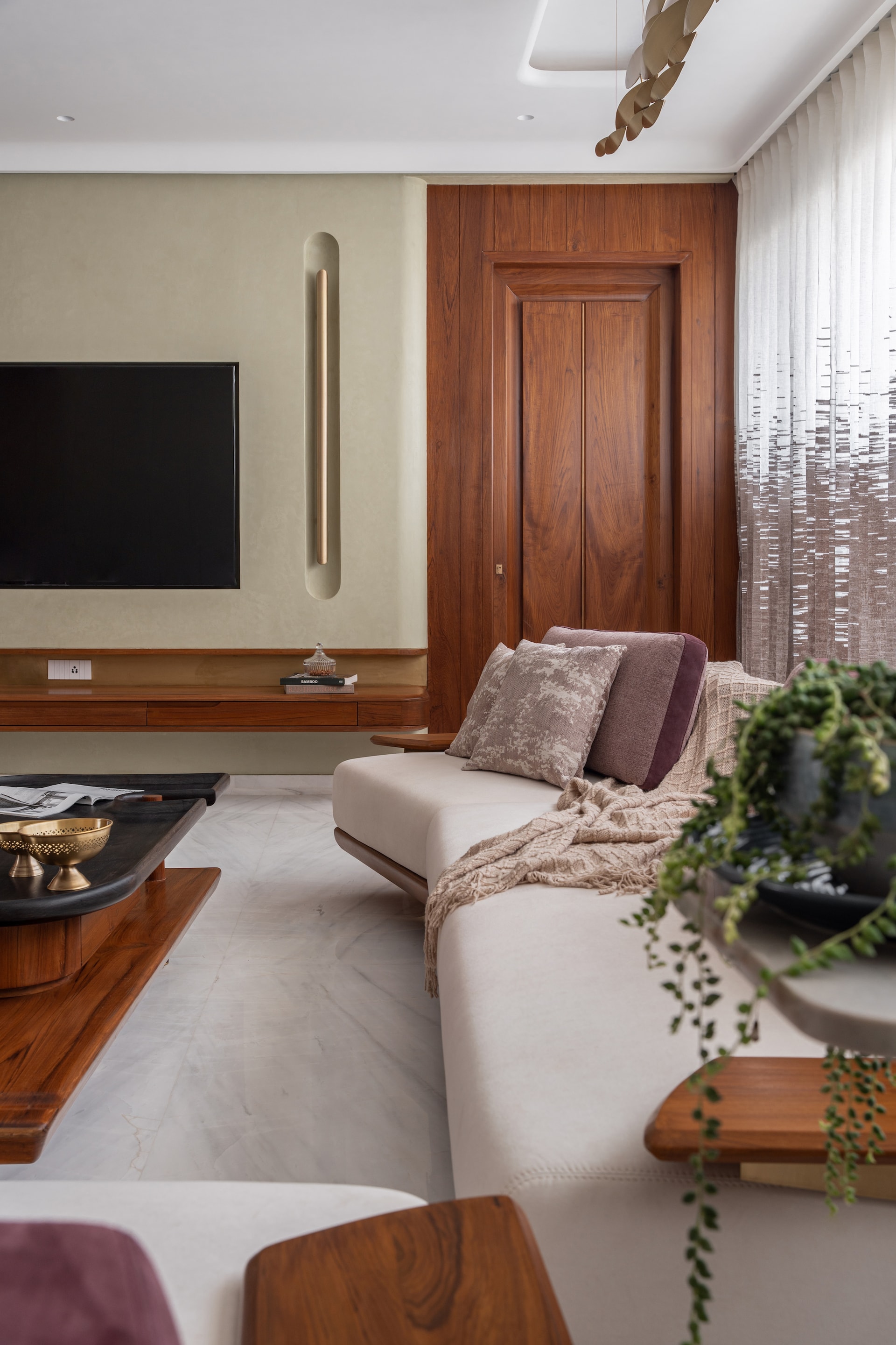 Enveloped in homogeneous marble flooring, the apartment welcomes one to the core that orchestrates the symphony of the entire design: the living room. The space boasts an aura of pristine simplicity and uncluttered elegance. The prominent highlight of this pivotal area is a captivating arrangement of tailored furniture, an eye-catching television unit design integrated with a sandstone wall, and gentle elemental punctures that demand attention while setting the tone for the entire home design. An open-plan layout blurs the boundaries between the living space, family quarters, and dining realm, fostering an inclusive atmosphere. The clean and crisp ceilings, with opulent fixtures in combination with commissioned wooden layers, infuse every corner with warmth and serenity. Embracing curvilinear edges, the living room exudes sheer tranquility with the soft shades of sandstone and wood through furnishings.