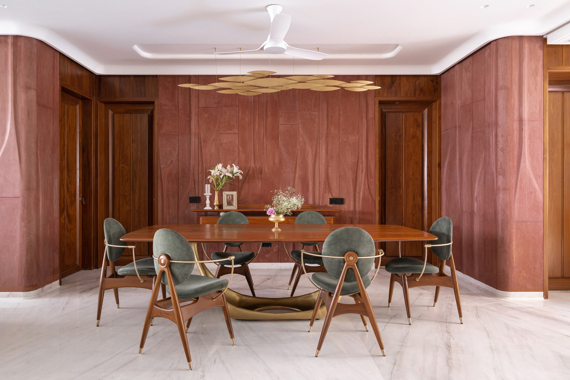Basked in ample daylight, the living room becomes a deft illustration of ingenious incorporation of furnishing palette, circular art pieces, and ombre curtains expressing affluent intricacy. Radiating understated elegance, the versatile sandstone surfaces on the wall connect the dining space to the living room. The chamfered and modern dining table of eight, featuring premium materials and resting on sculpted pure brass inlay, becomes the highlight of the area. Finely cushioned circular chairs complement the dining setup with brass inserts. Customised dining lights add character to the space. The dining area truly celebrates the earthen grains and hues, casting a cohesive design where every piece of furniture is thoughtfully intertwined to create an aesthetically pleasing and harmonious whole. Augmenting similar elements, the green fabrics gracefully extend to the dining room, where a seamlessly integrated dining console showcases the organic assembly of Burma teak wood and is embellished with a ritzy brass trim.
