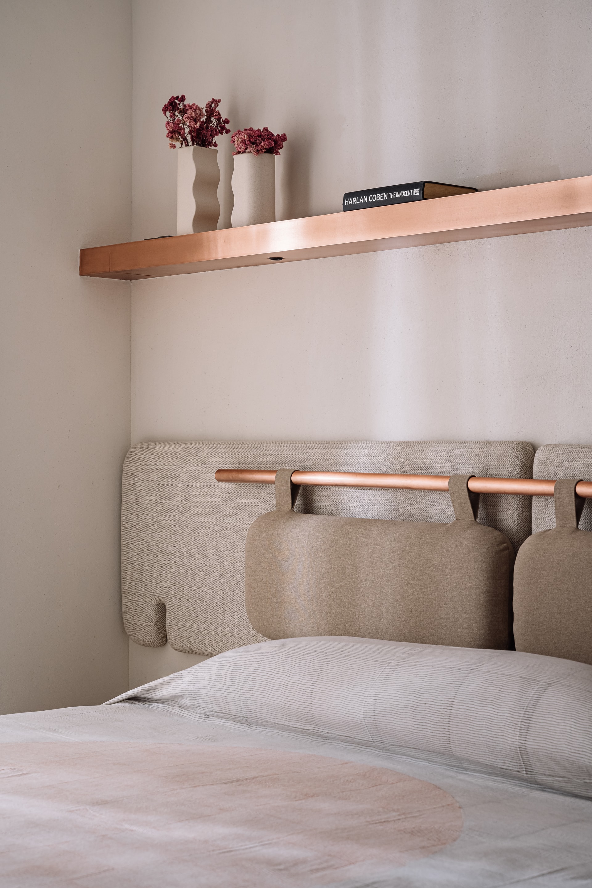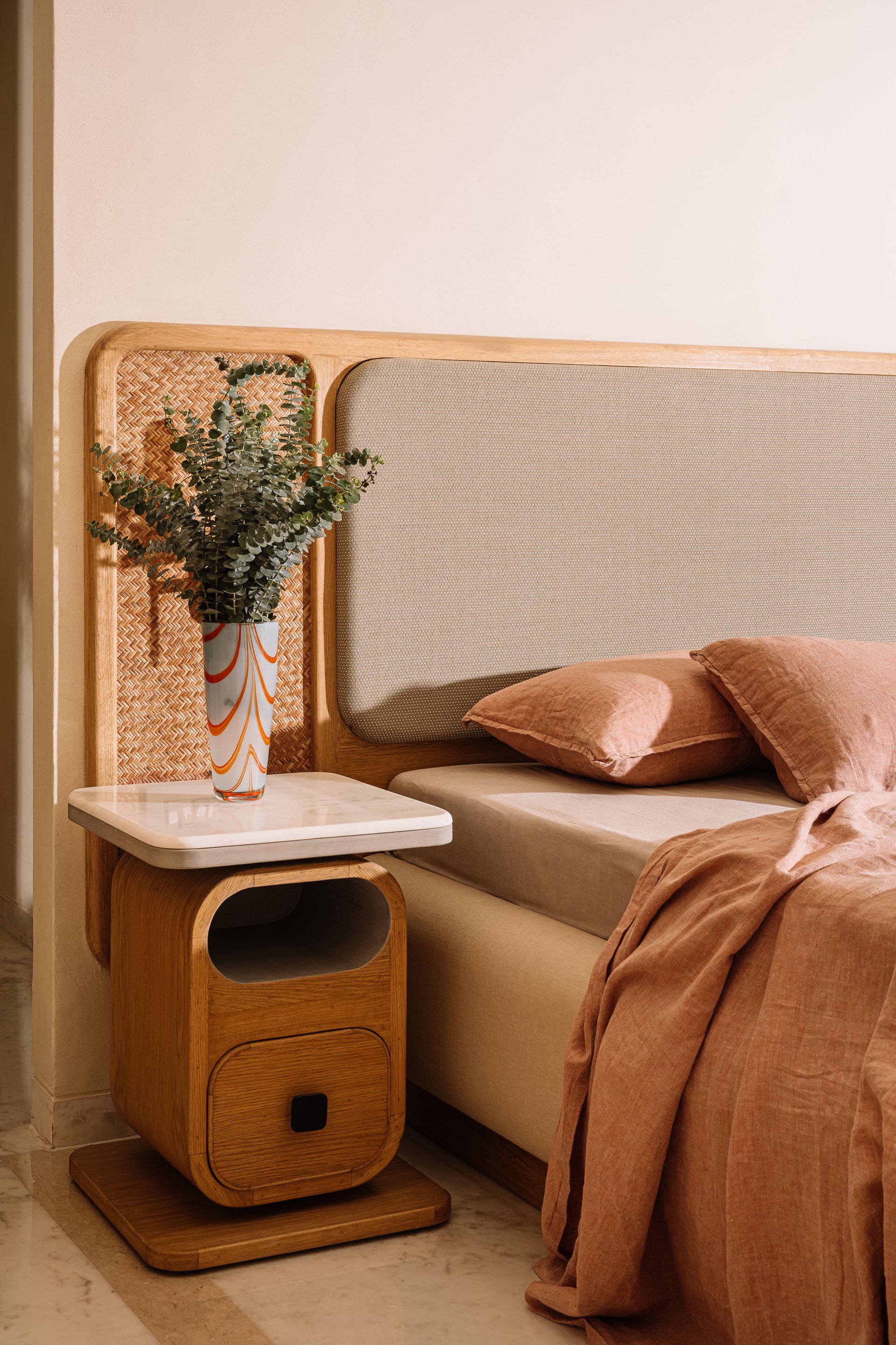 The third bedroom is definitely the finale of this trajectory of classic modernism. Bold and dynamic, to match the persona of the youngest member of the family it is scripted with convention-defying side tables, a sculptural light accent in the backdrop of grey textured walls and inlays of kesariyaji green marble on the floor.