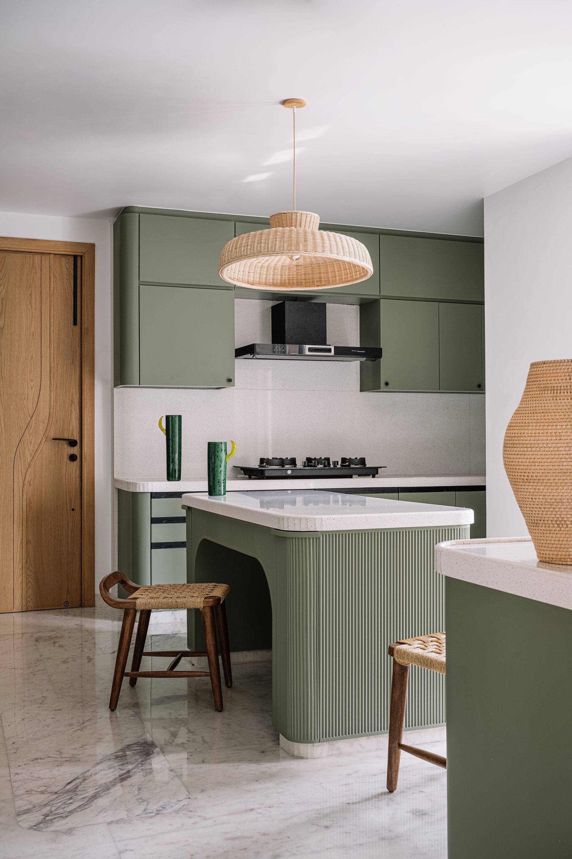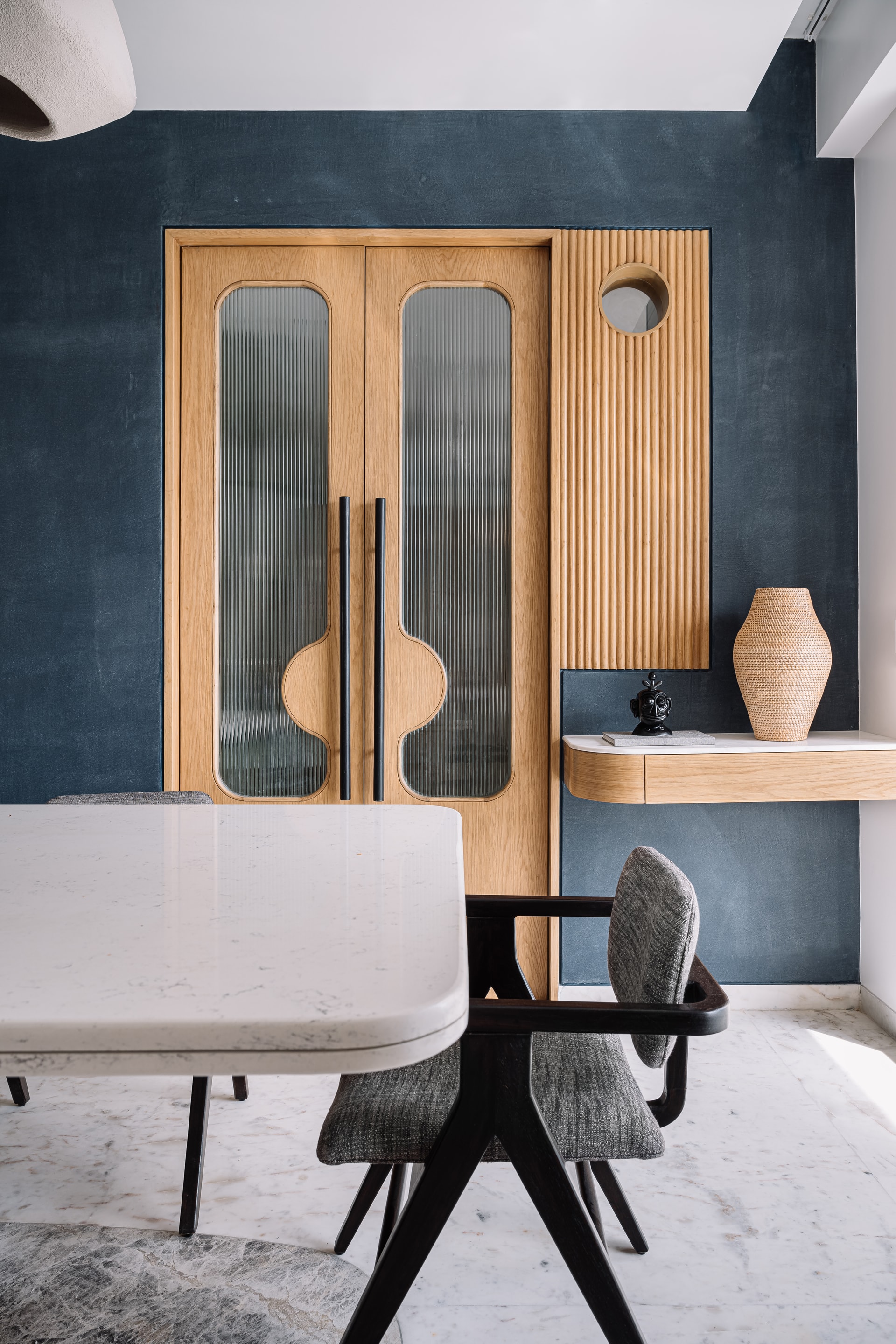 A sublime abstract sculpture of Shrinathji blesses the family from its exalted stance in the traditional temple as it opens gently into the living room. Multiple marble steps inside inspired by Carlo Scarpa’s works are adorned with miniature idols in the backdrop of deep-blued walls. The allure of art deco prevails through the dining area where a fog-grey stone inlay in an abstract ellipsoid design embellishes the floor. The pattern is reflected by the pendulum dining light, pivoted with a dining table that is a sculptural delight and balanced perfectly with a captivating painting by artist Shahanshah Mittal on the adjacent wall. Adjoined by a spacious kitchen in verdant olive green it looks more like a family bonding area over cooking or comfort munching.