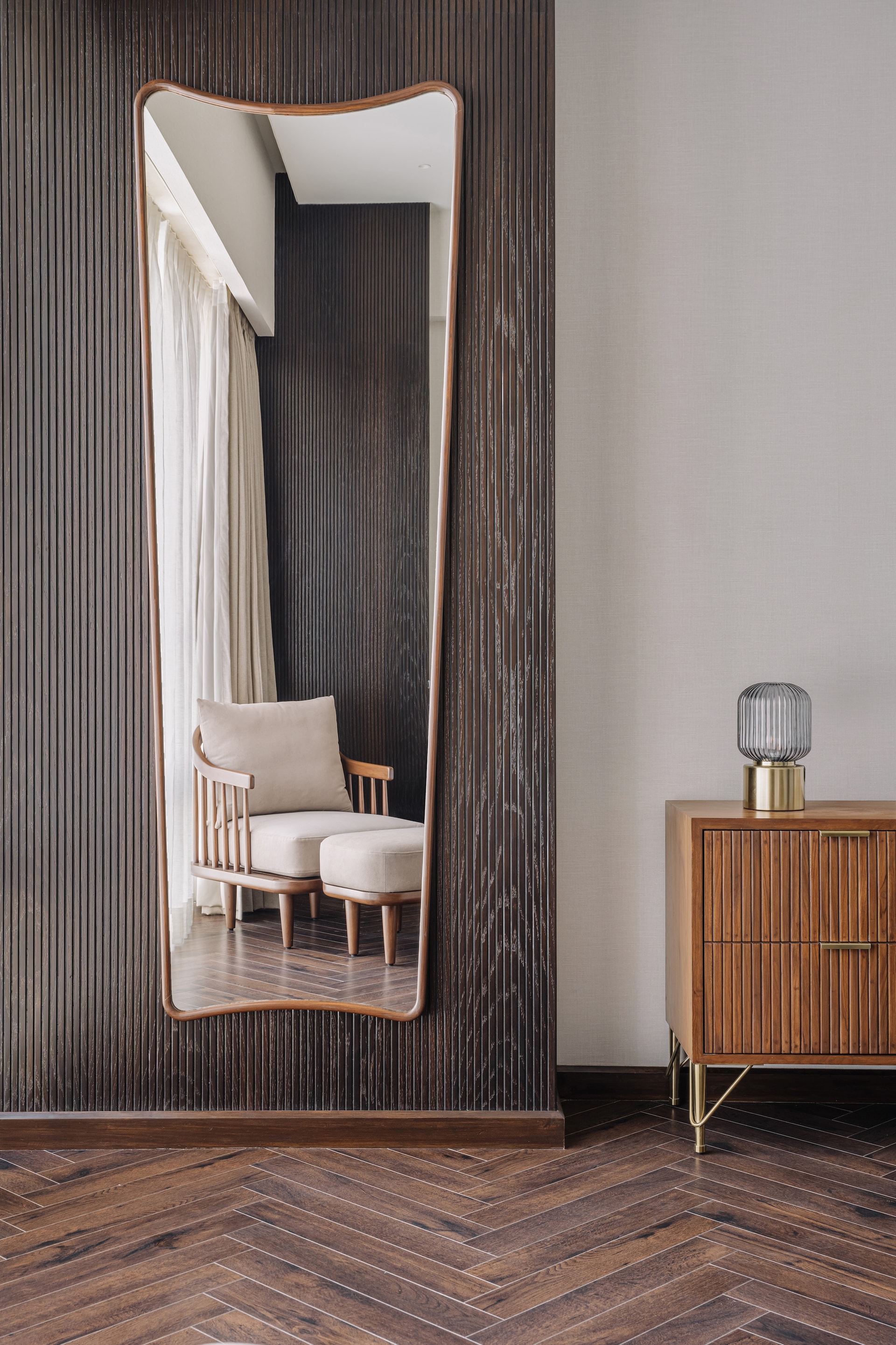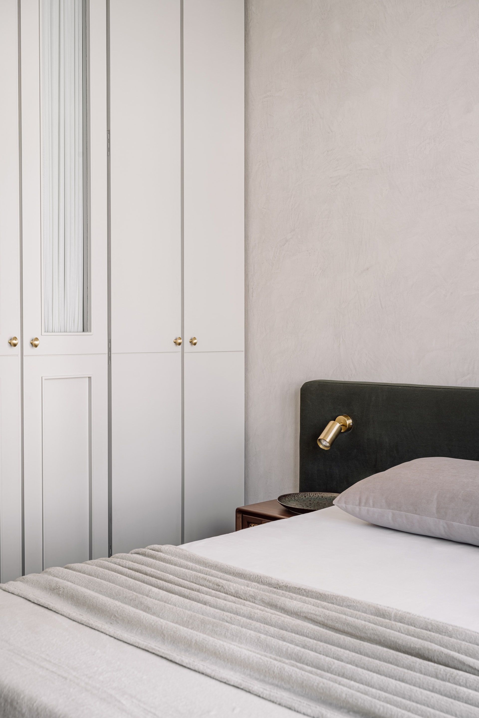 The second bedroom walks the fine line between the old and the new. The wall texture within the space lends it a grounded feel, introducing a sense of quiet dynamism. The colour green makes a debut in the form of the gently curved suede headboard. Rooted in texture, the bedroom is dotted with hints of wood, woven wicker, and brass in the form of furniture and lighting. Harbouring an old-world charm, the wardrobes have been imagined with glass infills lined by drapes. “The bedrooms at Pied-à-terre revel in simplicity! Yet, their persona is a sum of their many, painstakingly curated details, which elevates the experience of occupying them,” Aashni reflects.