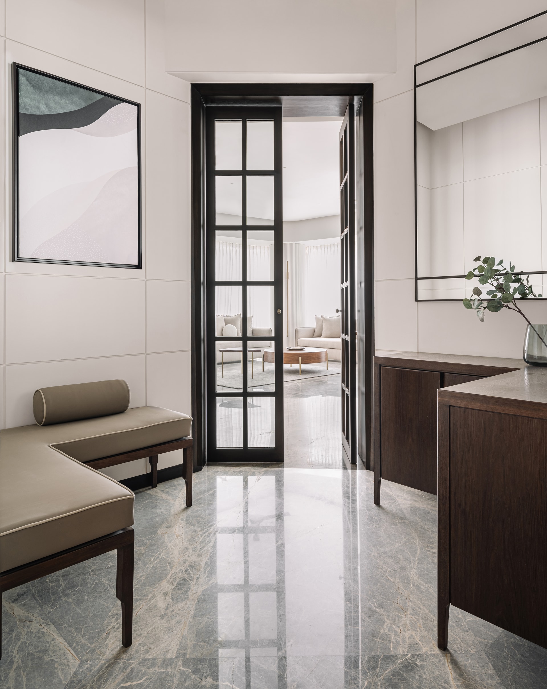 The gridwork detail in POP makes its way across the foyer’s perimeter, drawing the gaze upwards. The bespoke upholstered bench and wood storage console also bear an L-form shape to make the most of the square footage while maintaining a clear circulation passage. The mirror on one side turns strategically to reflect the duo of art prints displayed across from it. Slivers of green in myriad tones dot the area, hinting at its unassuming omnipresence throughout the residence. The tall French doors frame vignettes of the home’s communal spaces and facilitate the passage of light into the foyer’s heart. A handpicked variety of high-gloss grey-blue marble makes its way from the entrance into the residence. The marble variety bears a chameleon-like character as light plays off its surface, morphing through the day to reveal the stone’s ephemeral shades.