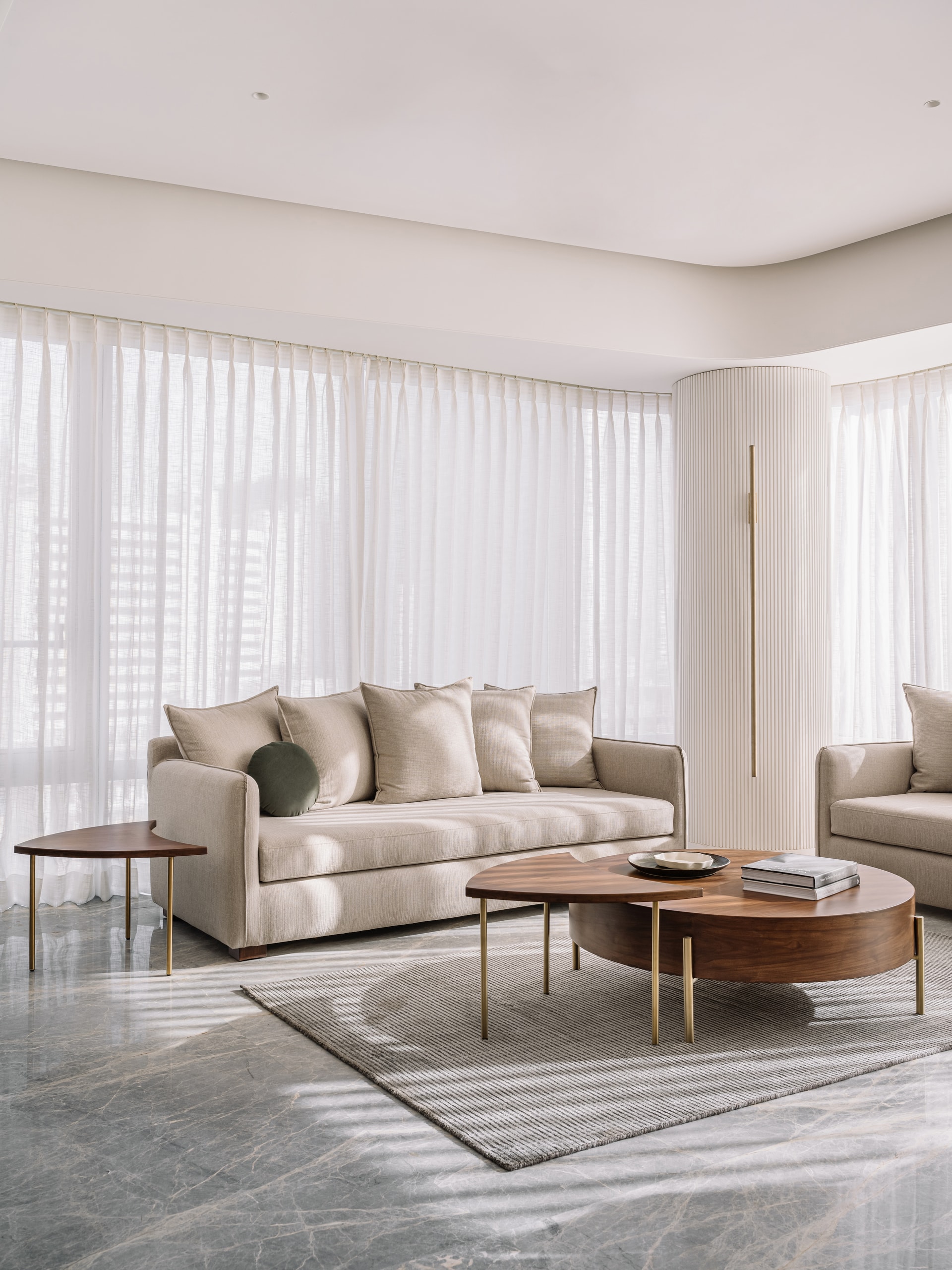 North-eastern sunlight swathes the communal nucleus of Pied-à-terre, breathing an animated quality into the marble floors. The living room can be visualised as the rightful oasis of the family, resting untethered from the urban stir. The space celebrates soft, organic geometry that reiterates an unobtrusive spatial flow. A beam along the living area’s glass-clad façade curves gently to double up as an enveloping pelmet holding diaphanous, sheer draping. The stoic structural column was treated adeptly to render it a homogeneous part of the space versus an awkward eyesore. Sheathed in a fluted surface finish, the column’s stature is further exemplified by the linear Hatsu wall light.