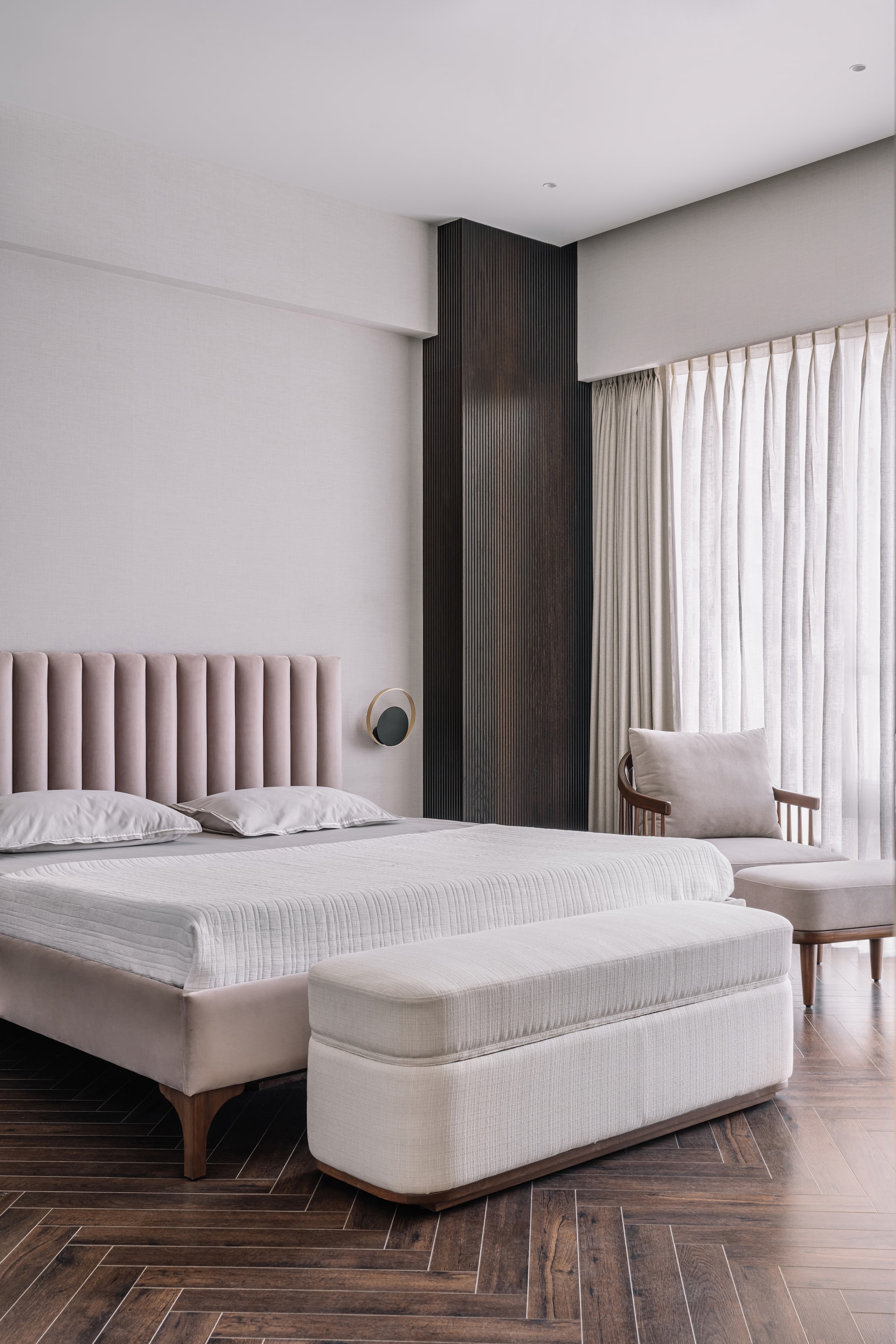 The furniture in the space created in alliance with Arjunvir Gujral Design Studio confesses its penchant for seamless silhouettes and muted tones, as seen in the spindle-back armchair, ottoman, and bed-end bench. In addition, linen sheers by Bharat Furnishings illuminate the space with diffused sunlight, underscoring the feeling of repose.