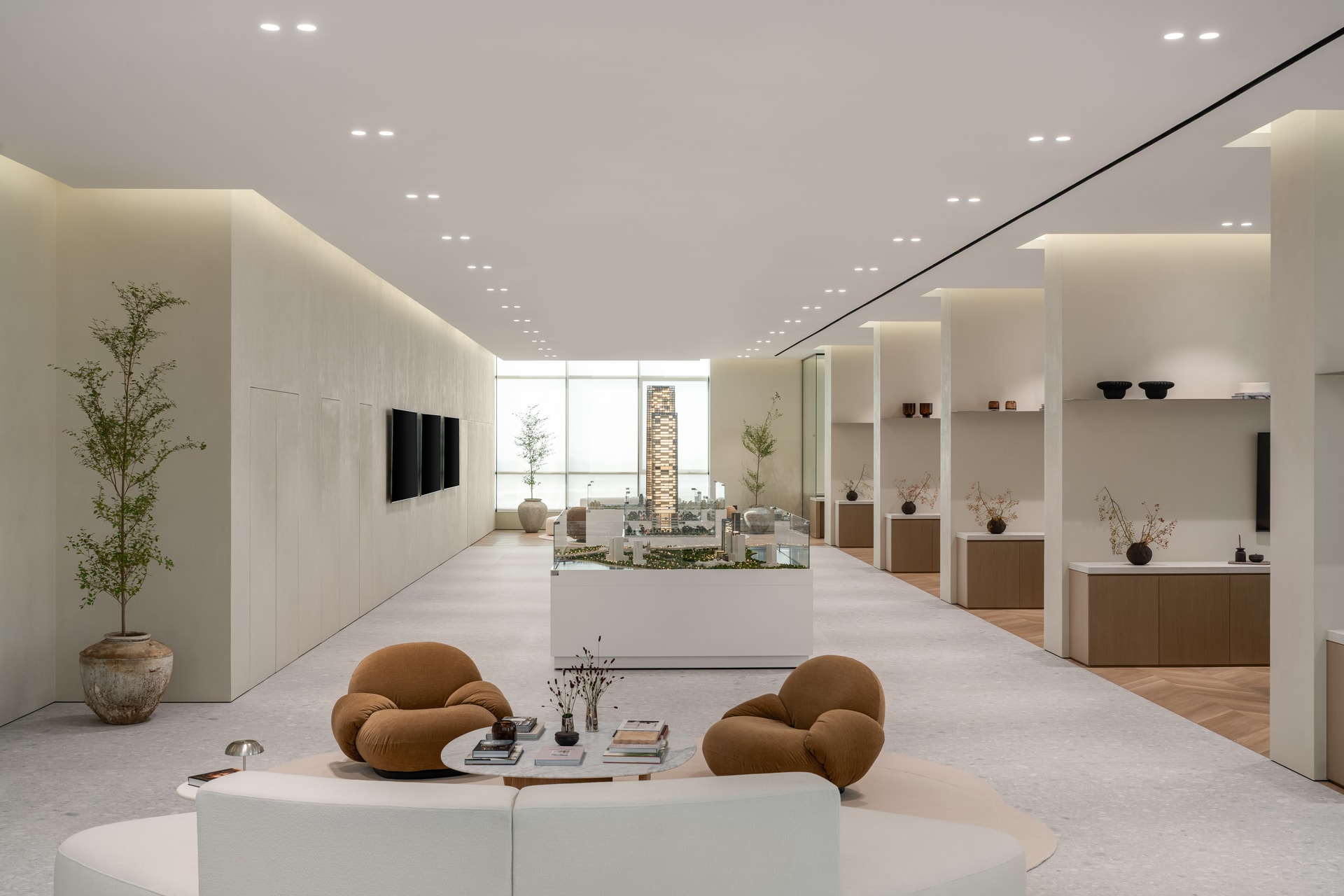 Rather than a traditional reception area, the entrance unfolds into a curated lounge defined by soft sculptural seating, marble-topped tables, and warm neutral tones. The spatial arrangement encourages conversation and relaxation, creating a setting that feels closer to a refined living room than a typical corporate waiting area.